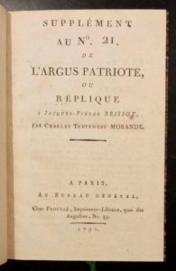 386. THÉVENEAU DE MORANDE (Charles). Supplément au n° 21 de l'Argus patriote, ou Réplique à Jacques-Pierre Brissot. Paris, Froullé, 1791, in-8, [2]-109 pp., demi-basane glacée blonde, dos à nerfs, tranches mouchetées (reliure du XIXe). Bon exemplaire.