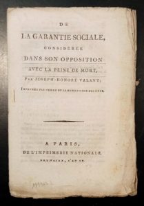 394. VALANT (Joseph-Honoré). De la Garantie sociale, considérée dans son opposition avec la peine de mort ; imprimée par ordre de la Commission des Onze. Paris, Imprimerie Nationale, brumaire an IV, (novembre 1795), in-8, VIII-95 pp., en feuilles, cousu.