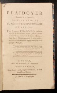 VILLENAVE (Mathieu-Guillaume-Thérèse de). Plaidoyer (prononcé le 5 frimaire), dans le procès du comité révolutionnaire de Nantes. À Paris, Chez les Marchands de nouveauté, À Nantes, Chez Brun, An III-1794, in-8, 95 pp., bradel demi-percaline fantaisie (rel. de la fin du XIXe).