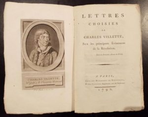 VILLETTE (Charles-Michel de). Lettres choisies sur les principaux événemens de la Révolution. Paris, Clousier, 1792, in-8, [4]-IV-366 pp. sur papier fort, avec un portrait-frontispice gravé par Gaucher, broché, couv. papier bleu de l'époque. Dos absent, infimes trous de ver sans gravité.