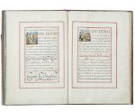 [ESPAGNE (BARCELONE) - MARTI]. — Manuscrit enluminé du début du XIXe siècle sur peau de vélin en un volume in-4° (210 x 310 mm), maroquin rouge, large encadrement de roulettes dentelées dorées ornant les plats, lacs de soie bleue, gardes de...