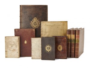 (3 parties), & •• Novi Testamenti, D. N. Iesu Christi. Præcipuæ historiæ et Visiones, picturis elegantissimis in æs incisis, repræsentatæ, Des Neiuen Testaments Unsers Herzen Iesu Christi […]. -- Franckfurt be idem Auctore zufinden, 1627. -- Ensemble 2 ouvrages en 4 parties & un volume in-8° oblong, vélin ivoire, double encadrement de filets dorés ornant les plats, couronne ducale aux angles, dos à nerfs orné (reliure allemande de l’époque).
