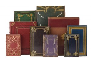 décor, doublure de maroquin rouge et dentelle à l'intérieur, gardes de tabis rouge, tranches dorées, couverture en couleurs conservée (Ch. de Haas – relieur – Paris).