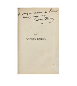 FRANCE (Anatole). -- Les Poëmes dorés. -- Paris, Alphonse Lemerre, Éditeur, 1873. -- In-12, maroquin rouge, armoiries dorées au centre des plats, dos à nerfs orné d’une pièce d’armes en pied (Bound by Sangorski & Sutcliffe. London).