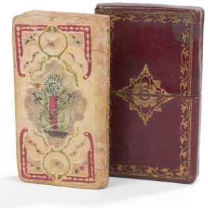 dorée sur les plats, rehaussée à la gouache de contours rouges et verts et de fleurs dans les compartiments, partie centrale peinte d’un décor allégorique représentant sur le premier plat une main provenant du ciel attrapant ce qui semble être un parchemin, et sur le second plat une colonne centrale rouge surmontée d’un soleil personnifié, entourée de deux dauphins et de ce qui paraît être deux épées, dos lisse orné, tranches dorées, étui à coulisse de maroquin rouge, orné sur les plats d’une roulette dorée en encadrement et de fers dorés au centre, tranches ornées (reliure et étui de l’époque)...Exemplaire bien conservé de cet almanach imprimé pour la famille royale, dans une agréable reliure peinte de l’époque et conservée dans un étui à coulisse de maroquin rouge réalisé vraisemblablement pour un autre exemplaire. Le dos de cet étui porte l’indication « Année nouve(lle) »...L’emblème aux dauphins figurant sur le second plat a fait penser à l’un des propriétaires de l’ouvrage au XIXe siècle, qui a laissé une note manuscrite, qu’il s’agissait de l’exemplaire ayant appartenu au dauphin Louis Joseph Xavier François de France (1781-1789), fils aîné de Louis XVI et de Marie-Antoinette. Cette affirmation nous semble hâtive et peu vraisemblable...Bon exemplaire malgré le fait que les peintures soient légèrement estompées et effacées par endroits. Les bords intérieurs de l’étui sont abîmés.