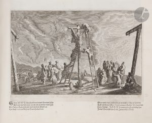 Melchior Küssel, 1670-1671. — 4 parties en un volume in-4 oblong, 285 x 335 : (5 ff.), 36 planches, (2 ff.), 35 planches, (2 ff.), 35 planches, (2 ff.), 35 planches. Demi-basane marbrée, dos à nerfs orné (reliure allemande du début du XIXe siècle)...Brunet, I, 707...Important recueil publié par le graveur de Augsbourg Melchior Küssel (1626-1683), réunissant 141 (sur 146) planches gravées par ses soins d’après les dessins du peintre, dessinateur et miniaturiste originaire de Strasbourg Johann Wilhelm Baur (1607-1642), considéré comme le meilleur des artistes alsaciens du XVIIe siècle...Küssel fut de ceux qui permirent la diffusion de l’œuvre de Baur dans toute l’Europe. Il acquit une grande partie des dessins de ce dernier après sa mort, qu’il publia notamment dans ce recueil présenté comme un ensemble d’iconographies pouvant servir de modèle aux artistes...Le recueil se divise en quatre parties dont les gravures représentent la vie et la passion de Jésus Christ, les allégories du vice et de la vertu, des paysages, des ports, des vues d’Italie, etc. Chaque planche possède une légende en allemand...Selon la description donnée par Brunet, cet exemplaire est incomplet de 5 planches, soit une dans les 3 premières parties et 2 dans la dernière...Papier des plats renouvelé, coiffes et charnières restaurées. Titre doublé, déchirures sans gravité et restauration à plusieurs planches..Provenance : N. Pimrock à Bonn, avec étiquette imprimée du XIXe siècle collée sur la première doublure.