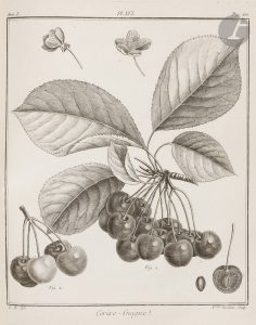blanc), 62 planches ; (2 ff.), 280 pp., 118 planches. Demi-veau marbré à coins, dos lisse orné, tranches mouchetées (reliure du XIXe siècle)...Nissen, 550. - Plesch, 210-11. - Madeleine Pinault Sørensen, Le livre de botanique, XVIIe et XVIIIe siècles, BNF, 2008...Édition originale de ce remarquable ouvrage qui vient en complément du Traité des arbres et arbustes qui se cultivent en France en pleine terre que Duhamel du Monceau donna en 1755...Celui-ci fut composé avec l’aide du botaniste René Le Berryais (1722-1807). Donnant les instructions indispensables et nécessaires aux jardiniers et aux amateurs de jardinage, il ne porte que sur les fruits de table, les auteurs excluant de ce fait les pommes et les poires à cidre ainsi que les raisins qui ne sont propres qu’à faire le vin. Madeleine Pinault Sørensen n’hésite pas à considérer ce traité comme « l’ouvrage fondamental sur le sujet ». Les fruits y sont étudiés selon leurs formes, leurs couleurs et leurs saveurs, il y est également question des insectes parasites et 6 chapitres portent sur la culture des arbres fruitiers en général...L’édition est illustrée d’un frontispice gravé par Nicolas de Launay d’après Jacques Eustache de Sève, et de 180 planches gravées d’après les dessins de Claude Aubriet (1665-1742), Madeleine Basseporte (1701-1780) et René Le Berryais, représentant les différents fruits décrits...Exemplaire sur grand papier...Reliures abîmées, coiffes arasées, quelques manques de cuir aux dos, coins émoussés, plats frottés. Très bon état intérieur malgré une mouillure dans la marge intérieure du cahier O dans le premier volume, et quelques feuillets légèrement brunis. Les planches sont parfaitement conservées.