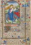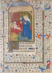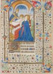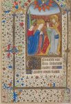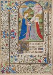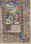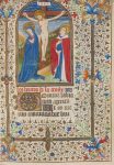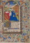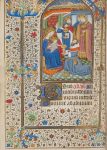 Reliure à la fanfare à relier à « l’Atelier du doreur à la première palmette » (?) (actif de 1560 à 1587 environ)..164 ff., manque le calendrier et les péricopes évangéliques ; manque une miniature aux Heures de la Croix (collation : i2, ii8, iii8, iv8, v8, vi8, vii8, viii8, ix8, x8, xi8, xii6 (manquent iii, iv, v [un feuillet blanc inséré mais non d’origine]), xiii8, xiv8, xv8, xvi8, xvii8, xviii8, xix8, xx8, xxi3 (i d’un cahier antérieur et 2 ff. de prières rajoutées), écriture gothique à l’encre brune de la première moitié du XVe, deux feuillets rajoutés d’une main de la fin du XVe s. (ff. 162-163), texte sur une colonne (justification : 60 x 102 mm), 15 à 17 lignes de texte, réglure à l’encre rouge, rubriques en rouge, bouts-de-ligne en rose foncé ou bleu avec rehauts blancs et décor à l’or bruni, initiales d’une ou deux lignes de hauteur à l’or bruni sur fonds rose foncé ou bleu avec rehauts blancs, grandes initiales de 3 lignes de hauteur en bleu ou rose avec rehauts blancs et décor de feuillages colorés sur fonds à l’or, bordures enluminées sur tous les feuillets dans la marge extérieure avec des tiges tracées à l’encre noire, des feuilles de vigne à l’or bruni, des entrelacs et motifs de feuilles, des fleurs et fruits, AVEC 11 MINIATURES à trois-quarts de page, bordures enluminées, la plupart avec feuilles d’acanthe et fleurs sur fonds réservés, doublées de baguettes enluminées sur fonds d’or...