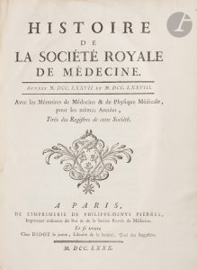 ff.), 14 tableaux, 16 planches ; xxij pp., (1 f.), 324, 648 pp., (2 ff.), 30 tableaux, 3 planches ; xj pp. mal chiffrées xiv, 268, 690 pp., (1 f.), 15 tableaux, 15 planches ; (2 ff.), xvj, 392, 430 pp., 30 tableaux, 15 planches ; (2 ff.), xij, 300, 582 pp., (1 f. bl.), 30 tableaux, 2 planches ; (2 ff.), 7, 223, 359 pp. ; (2 ff.), viij, 318, 434 pp., 26 tableaux ; (2 ff.), vij, 320, 386 pp., 13 tableaux, 2 planches ; viij, xxxvj, viij, 201, 628 pp. ; xij, clxx pp., (1 f.), 606 pp mal chiffrées 608, 1 carte, 3 planches. Veau et basane marbrés, dos à nerfs orné, tranches rouges (reliure de l’époque)...Collection complète de cette publication périodique de la Société Royale de Médecine. .Cette dernière est née de la volonté de trois hommes : Turgot, Jean-François de Lassonne, médecin de la Reine Marie-Antoinette, et Félix Vicq d’Azyr, médecin anatomiste et membre de l’Académie des sciences. Elle avait parmi ses missions le devoir de publier les observations et les mémoires qu’elle avait recueillis et approuvés..La collection compte 10 tomes publiés entre 1779 et 1798. À l’exception du dernier, chaque volume est composé de deux parties avec une pagination séparée..On compte au total 1 frontispice, 158 tableaux, 56 planches et 1 carte...Épidermures, frottements d’usage, coiffes arrasées, quelques travaux de vers. Très bon état intérieur malgré parfois quelques rousseurs sans gravité...On joint :.- Mémoires de l’Académie royale de chirurgie. Paris : P. Al. Le Prieur, 1761 (tome 1), 1769 (tome 2), 1768 (tome 4) ; Paris : P. Fr. Didot le jeune, 1774 (tome 5). — 4 volumes in-4 (sur 5), 255 x 190 : frontispice, xl, 778 pp. 20 planches ; frontispice, (2 ff.), xcvii pp., (3 ff.), 612 pp., (1 f.), 22 planches ; frontispice, (2 ff.), 123, 699 pp., 9 planches ; frontispice, (2 ff.), xvj, 928 pp., 19 planches. Veau marbré, dos à nerfs orné, tranches rouges (reliure de l’époque)...Nouvelle édition des 2 premiers volumes et édition originale des tomes 4 et 5 de ce précieux recueil de mémoires et observations de l’Académie royale de chirurgie...L’illustration se compose de 4 frontispices dessinés et gravés par Cochin fils, le même pour chaque tome, 4 vignettes de titre d’après Boucher et Eisen, 6 en-têtes d’après Humblot et Eisen, 6 lettrines et 70 planches...Il manque le tome 3 remplacé, dans une reliure identique, par le volume suivant :.- Recueil des pièces qui ont concouru pour le prix de l’Académie royale de chirurgie. Tome III. Paris : P. Al. Le Prieur, 1759. — In-4, 255 x 192 : frontispice, (4 ff.), 616 pp..Édition originale illustrée d’un frontispice gravé d’après Boucher, d’une vignette de titre et d’un bandeau gravé d’après Humblot...Fentes à certaines charnières, plusieurs coiffes arasées, frottements d’usage, second plat du dernier volume abîmé. Mouillures claires dans le premier et le dernier volume...CES 15 VOLUMES OFFRENT UN ENSEMBLE DES PLUS PRÉCIEUX POUR L’HISTOIRE DE LA MÉDECINE.