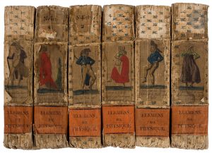 19 planches ; (2 ff.), 535 pp., 14 planches ; vj pp., (1 f.), 592 pp., 24 planches ; jv, 526 pp., 20 planches. Broché, couverture de papier dominoté, vignettes postérieures et étiquettes collées au dos, non rogné...Nouvelle édition de ce célèbre ouvrage qui contribua à répandre le goût de l’étude de la physique expérimentale en France. Il est l’œuvre du physicien Jean Antoine Nollet (1700-1770)...L’édition est illustrée d’un frontispice et de 116 planches dépliantes...Rare exemplaire dont les 6 volumes sous papier dominoté de l’époque arborent aux dos une vignette populaire distincte, gravée et en couleurs, de la période révolutionnaire, donnant notamment 3 très rares représentations de danseurs. Chaque personnage est accompagné d’une légende : Cateau à la belle Jambe au Bastringue de Vaugirard. - Le fin danseur Jingeolet. - Le Citoyen Tapogionici Tambourin d’amour. - L’Indolente Julie à la promenade du Cours la reine. - L’Intrépide Manon la sauteuse du Port à l’Anglais. - Le Vigoureux Jérôme. Port de la Halle aux Bleds...L’étiquette portant au dos le nom de l’auteur, manque à 4 volumes. Les vignettes gravées présentent des déchirures et quelques manques. Couvertures salies, quelques déchirures sur les bords. Le premier plat de la couverture, les 20 premières pages et les 2 premières planches du dernier volume ont été abîmés par une large mouillure qui a collé plusieurs feuillets entre eux et causé la perte de plusieurs parties de texte.