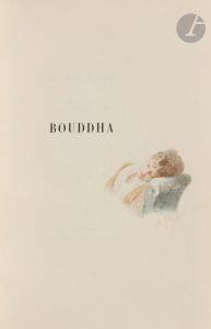 CLARETIE (Jules)..Bouddha..Paris : Librairie L. Conquet, 1888. — In-18, 160 x 107 : frontispice, (2 ff.), 84 pp., couverture imprimée. Maroquin havane clair, plats ornés d’un cadre de style asiatique composé de bandes de maroquin marron à...