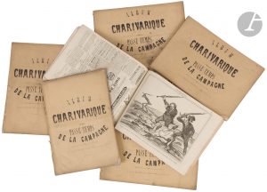 présente une série de lithographies et de bois de Daumier, Vernier, Cham, etc., tirées du journal Le Charivari. Il s’agit d’albums factices dont pratiquement tous les exemplaires sont différents. Publiés par Le Charivari, ils sont pourvus d’une couverture spéciale portant le nom de Martinet comme éditeur. Chaque épreuve comprend le texte imprimé du Charivari au verso..Ces 7 albums contiennent au total 279 lithographies et gravures sur bois, soit entre 39 et 41 par volume, dont 143 de Daumier, 74 de Cham, 50 de Vernier, 9 d’Édouard de Beaumont, 1 de Bouchot et 2 dont l’artiste n’est pas identifé. Au moins 3 lithographies sont en double..Couvertures salies et présentant quelques déchirures. Les lithographies sont très bien conservées.