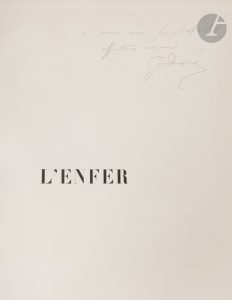 1877-1868. — 3 volumes in-folio, 432 x 312 : frontispice, (2 ff.), IV, 194 pp., (1 f.), 75 planches (L’Enfer) ; (4 ff. premier blanc), 204 pp., 41 (sur 42) planches (Le Purgatoire) ; (4 ff. premier blanc), 202 pp., (1 f.), 18 planches (Le Paradis). Percalines rouges imprimées de l’éditeur...Leblanc, pp. 78 à 80...Ensemble des 3 titres qui forment La Divine comédie de Dante, illustrés de main de maître par Gustave Doré, comprenant un portrait de Dante en frontispice de L’Enfer et 134 (sur 135) planches sur fond teinté chine (75 dans L’Enfer, 41 (sur 42) dans Le Purgatoire et 18 dans Le Paradis). Chaque planche possède une serpente numérotée et légendée...« Une des plus grandes entreprises que Gustave Doré ait conçue, étudiée et mûrie longtemps avant sa publication… [Il] n’hésita pas à enfouir toutes ses économies dans la publication de cet ouvrage. «Vous en vendrez quatre cents exemplaires», lui répétait Hachette. On tira l’édition à trois mille : elle était épuisée au bout de quelques jours. Succès mérité, car on ne rencontre dans aucun autre ouvrage illustré par Doré, de plus beaux dessins que dans celui-ci » (Leblanc, p. 78)...L’Enfer parut pour la première fois en 1861. L’exemplaire que nous avons ici est une réédition faite en 1877 mais il comporte un envoi de Gustave Doré à Joseph Michel : .à mon ami Joseph Michel // affectueux souvenir // GDoré .Il s’agit du docteur Joseph Michel qui était le neveu de Gustave Doré et l’héritier de l’artiste...Le Purgatoire et Le Paradis sont ici en premier tirage. Chaque volume est l’un des 100 exemplaires numérotés sur papier vélin..La première planche du Purgatoire a été reliée entre les pages 36-37 et il manque malheureusement la planche 15 dans le même volume...Exemplaires en cartonnages de l’éditeur. Il manque le premier caisson au dos de l’exemplaire du Paradis. Les deux autres cartonnages sont dans un bon état de conservation, avec seulement des défauts d’usage notamment des usures à la coiffe de tête du Purgatoire...Provenance : Joseph Michel pour le volume de L’Enfer, avec envoi de Gustave Doré. - Ex-libris RG dans les deux autres volumes, dessiné par Colin et gravé par Devambez.