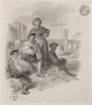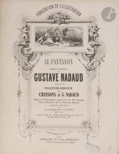 l’Illustration des partitions de chansons du poète et chansonnier Gustave Nadaud (1820-1893). Elles parurent en même temps en recueil ou séparément, publiées par Heugel. Trente-trois de ces partitions étaient illustrées d’une vignette gravée sur bois de Gustave Doré et Heugel en publia 32 séparément, très difficile à réunir aujourd’hui..Nous avons ici 22 de ces 32 partitions. Elles comprennent deux ou trois feuillets et l’illustration se trouve sur le titre, dans un bel encadrement rocaille. On y trouve les titres suivants : La Dame au pastel (2 ex.). - Le Cavalier. - Le Fantassin. - Le Rendez-vous (2 ex.). - L’Étamine (2 ex.). - Le Froid à Paris. - Les Malheureux. - Chant d’amour. - Les Deux ombres. - L’Estomac. - Conseil à Marie. - Quinze avril. - St Mathieu de la Drôme. - Le Pommier. - Une expiation. - Cheveux noirs et blancs. - Le Livre favori. - Les Bosses de Gros-Jean. - Demain (2 ex.). - Éloge de la vie. - Le Portrait de Toinon. - Le Prince indien...On joint 3 autres rares partitions séparées et un recueil de chants, illustrés chacun d’une très belle lithographie de Gustave Doré :.- Bembaki & le diable. Ballade d’Edmond Got. Musique de Edmond Membrée. Paris : Au Ménestrel, Heugel & Cie, s.d. — 4 ff. in-folio, en feuilles. Premier et dernier feuillets séparés..- Le Roi solitaire. Mélodie pour voix de Basse. Poésie de Théophile Gautier, Musique de Ernest Doré. Paris : Au Ménestrel, Heugel & Cie, s.d. — 2 ff. in-folio, en feuilles..- Le Chasseur. Mélodie pr Baryton. Poésie de Théophile Gautier, Musique de Ernest Doré. Paris : Au Ménestrel, Heugel & Cie, s.d. — 2 ff. in-folio, en feuilles..- LAMAZOU (Pascal). 50 Chants Pyrénéens. 34 airs béarnais, 14 aires basques, 2 airs des Pyrénées-Orientales. Recueillis, Chantés et Publiés par Pascal Lamazou. Paris : Pascal Lamazou ; Pau : Pascal Lamazou, Cachau, Lafon, 1877. — In-folio, (2 ff.), 101 pp., (1 f.), 1 planche, couverture imprimée. Broché..Édition rare, illustrée d’une belle lithographie de Gustave Doré, datée de 1874, tirée sur chine collé. Rousseurs...Rousseurs, mouillures dans quelques marges. L’ensemble est conservé dans une chemise de réemploi sans lien avec les partitions.