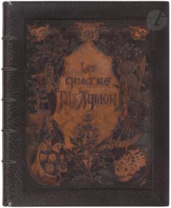 H. Launette, 1883. — In-4, 277 x 222 : (3 ff.), 8 pp., (1 f.), pp. 9-224, (8 ff.), sous double couverture imprimée et illustrée. Maroquin noir, bords des plats biseautés, premier plat orné d’une grande composition en cuir ciselé signée HMM (Henri Marius Michel) représentant un riche encadrement fait de trophées et d’animaux, s’inspirant de l’illustration du livre, titre dans le cartouche central, dos à nerfs, encadrement de maroquin noir à l’intérieur, orné de deux filets dorés, doublures et gardes de soie brique, tranches dorées, couvertures et dos conservés (Marius Michel)...La plus belle édition illustrée de ce texte inspiré d’une légende du Moyen Âge, ornée à chaque page de compositions en couleurs d’Eugène Grasset...Il s’agit du premier livre imprimé grâce au nouveau procédé de photogravure et chromographie inventé par Charles Gillot..L’illustration rompt avec la norme de l’époque, venant déborder voir se superposer au texte. Cet ouvrage fut reconnu tardivement comme précurseur et annonciateur de l’Art nouveau...Un des 200 exemplaires du tirage de luxe, celui-ci faisant partie des 100 numérotés sur papier de Chine (n° 191)...Superbe exemplaire en reliure ciselée strictement de l’époque, conçue par Marius Michel...Quelques rousseurs éparses, comme presque toujours avec les exemplaires sur chine.