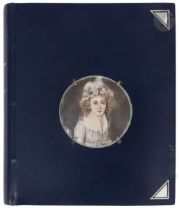 d’un filet peint en noir aux angles des plats, miniature originale sous verre placée au centre du premier plat, dos lisse, doublures bords à bords de box bleu foncé, gardes de daim bleu foncé, non rogné, couverture conservée, étui-boîte à dos plat et tranches de box bleu foncé (M.-J. Guian-Milliaud)...Édition originale peu courante de ce célèbre livre de physionomie, qui connut de nombreuses rééditions. C’est l’édition que l’on rencontre le moins souvent...L’étude de la physionomie était très en vogue à la fin du XVIIIe et en ce début de XIXe siècle, impulsée notamment par le pasteur suisse Johann Caspar Lavater (1740-1801). Cette science avait pour dessein, en observant et analysant le physique d’une personne, particulièrement le visage, de découvrir sa personnalité, ses sentiments et ses émotions...C’est ce qu’Édouard Hocquart, auteur présumé du livre, tente ici de nous apprendre concernant les femmes, montrant « que l’expression de la vertu, de l’innocence, de la candeur, ainsi que celle du vice, appartiennent à certains traits caractéristiques ». Il s’agit surtout d’une œuvre de vulgarisation des études physiognomoniques de Lavater..L’édition est illustrée de 30 planches dont 28 en couleurs représentant des visages féminins...Très bel exemplaire enrichi sur le premier plat d’une miniature originale peinte du XVIIIe ou du début du XIXe siècle, représentant une femme en buste vue de face. La reliure fut réalisée par Marie-José Guian-Milliaud, pour son propre compte...Exemplaire complet mais les pages 8 à 10 ont été reliées par erreur au début et le feuillet de faux titre avant la page 13.