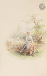 dorées et mosaïquées de maroquin bleu foncé et havane aux angles sur les plats, dos à nerfs orné de filets dorés et de fleurs mosaïquées, encadrement de maroquin bleu à l’intérieur, orné de filets et de motifs dorés, doublures et gardes de soie brochée rose, doubles gardes, tranches dorées sur témoins, couverture conservée, étui (Marius Michel)...Édition de luxe tirée à 351 exemplaires, illustrée de 62 belles compositions du peintre suisse Louis Dunki (1856-1915), dont 8 à pleine page, gravées sur bois par Clément Bellenger..Un des 245 exemplaires sur vélin à la cuve des papeteries du Marais, celui-ci faisant partie des 100 contenant une suite des illustrations sur chine ou sur japon, ici sur chine..Exemplaire spécialement imprimé pour Marius Michel, relié par ses soins et enrichi d’une très belle aquarelle originale en couleurs sur japon, non signée..Dos et plats en partie reteintés.