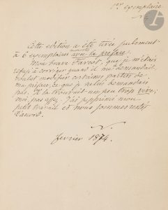 à nerfs orné, dentelle dorée intérieure, tête dorée, non rogné (reliure de l’époque)...Véritable édition originale tirée à seulement 6 exemplaires, les seuls contenant la préface de Nadar, qui sera supprimée dans l’édition de 1874..Il s’agit du récit du voyage du ballon le Louis-Blanc réalisé le 12 octobre 1870 par Eugène Farcot qui venait de rejoindre l’équipe d’aéronautes fondée par Nadar. Les vols que ce dernier organisait, avaient pour mission de communiquer « les messages d’État […] et aussi toute la correspondance des assiégés parisiens ». Le Louis-Blanc fut le troisième ballon-poste à partir. Farcot n’avait jamais fait d’ascension mais Nadar lui fit suffisamment confiance pour lui laisser la conduite de ce ballon. Le voyage fut périlleux mais mené à bien...Précieux exemplaire personnel de Nadar, portant plusieurs ajouts et corrections autographes dans la préface, notamment page 14, et quelques notes et corrections au crayon dans le texte de Farcot (pp. 24 et 27)...Nadar a ajouté 3 notes. Les deux premières, signées, figurent sur la première garde blanche :..1er exemplaire. N.Et.Cette édition a été tirée seulement à 6 exemplaires numérotés avec la préface. Mon brave Farcot, que je m’étais refusé à corriger quand il me le demandait, voulut modifier certaines parties de ma préface, ce que je ne lui demandais pas. Il la trouvait un peu trop vive ; moi, pas assez. J’ai supprimé mon petit travail et nous sommes restés d’accord. N. février 1874...La troisième note figure en tête de la préface :.Cet exemplaire seul contient cette préface que l’excellent homme, auteur de ce petit livre, m’avait demandée, mais qui parut lui causer quelqu’appréhension. Il me demanda de la supprimer dans l’édition publiée, ce qui fut fait. - je n’en gardai qu’une épreuve pour moi...Nadar semble confondre « exemplaire » et « édition » au début de la dernière note, car la préface se trouve bien dans les autres exemplaires que nous avons trouvés. Celui-ci, non numéroté, constitue semble-t-il l’une des 2 épreuves connues du texte, comptant dans ce tirage de 6. L’autre a été vendue lors d’une vente de photographies chez Pierre Bergé le 14 mars 2018..Aucun des 6 exemplaires ne semble figurer dans les bibliothèques publiques françaises. Deux se trouvent aux États Unis...Nadar a fait rajouter, contrecollés sur papier vergé, le titre illustré, une gravure du « Départ de Gambetta pour Tours, par le ballon Barbès, le 7 octobre », deux planches sur double page, celles qui doivent figurer dans l’ouvrage, et une coupure de journal figurant « L’ascension du «Géant» par Nadar ». On trouve également à la fin une facture de la maison Mawson & Swan de Newcastle datée du 6 mars 1878, adressée à Nadar, et plusieurs coupures de journaux sur ce dernier...Exemplaire parfaitement conservé malgré des décharges importantes des gravures ajoutées sur les feuillets en regard...Provenance : Nadar, avec ex-libris et son N doré au bas du dos.