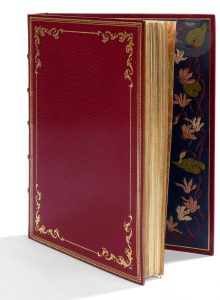 nerfs orné, doublures de maroquin bleu orné d’un encadrement floral mosaïqué de maroquin rouge, beige, vert et chair, gardes de soie brochée rouge, doubles gardes, tranches dorées, couverture conservée, étui (A. Cuzin). ..Édition de grand luxe tirée à seulement 115 exemplaires sur papier vélin, illustrée de 9 eaux-fortes en couleurs d’André-Charles Coppier, dont une sur la couverture, une sur le titre, 4 dans le texte et 3 à pleine page. Chaque page de texte est en outre ornée d’un encadrement floral colorié à la main...On trouve en tête une Note pour les bibliophiles, apportant ces précisions : « Les illustrations de cette plaquette que nous présentons aux Bibliophiles, réalisent une innovation dans l’Estampe polychrome et sont obtenues par trois planches repérées, tirées exclusivement avec les trois couleurs primaires, sans aucune retouche, et sans « pose » dans le tirage des tons. […] Ces illustrations sont présentées comme les premiers essais de cette conception nouvelle de l’Estampe. Elles ont été exécutées par M. Ch. Coppier dans le but de rechercher la plus grande variété de tons et de donner dans neuf eaux-fortes polychromes autant d’aspects particuliers et divers, ainsi que l’illusion et la fraîcheur des aquarelles originales »...Précieux exemplaire, un des 15 réservés à M. A. Girard, enrichi d’une épreuve avant la lettre des figures de la couverture, du titre et de celles dans le texte, d’une décomposition des couleurs de toutes les gravures, et du prospectus de parution. Il est conservé dans une splendide reliure doublée et mosaïquée de Cuzin...Exemplaire parfaitement conservé malgré quelques décharges des gravures.