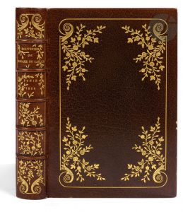 couverture illustrée. Maroquin vert foncé, plats ornés d’un encadrement doré composé d’un filet et d’une volute décorée de fleurs aux angles, dos à nerfs orné de fleurs dorées, doublures et gardes de box beige orné d’un riche décor de fleurs dorées et mosaïquées, doubles gardes, tranches dorées, couverture et dos conservés (P. Ruban 1908)...Nouvelle édition tirée à 350 exemplaires, illustrée d’un portrait de Madame de Caylus en frontispice, de 4 têtes de chapitres, 4 culs-de-lampe et 4 planches, gravés au burin et à l’eau-forte par Léon Boisson d’après les compositions de Lionel Péraux..Exemplaire sur vélin du Marais, comprenant 3 états des gravures (eau-forte pure avec remarque, avant la lettre avec remarque et état définitif)..Précieux exemplaire du relieur Pétrus Ruban, superbement relié par ses soins l’année même de la parution de l’ouvrage..Dos et bords des plats passés...Provenance : Petrus Ruban, avec ex-libris doré au bas de la première doublure.