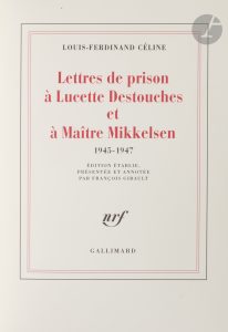 9-617, (2 ff.), couverture imprimée. Demi-maroquin rouge à coins, filets dorés, dos à nerfs, tête dorée, non rogné, couverture et dos conservés (D. Montecot)...Édition originale...« Ces Lettres à la N.R.F. regroupent […] l’ensemble des lettres retrouvées envoyées aux divers responsables [des publications de Céline] aux Éditions Gallimard. Principalement Gaston Gallimard bien sûr, qui a suivi toute sa carrière, mais aussi Jean Paulhan, le premier à le republier après la guerre, et Roger Nimier, qui s’est occupé de ses livres à partir D’un château l’autre et lui a véritablement fait renouer avec la faveur du public. Lorsqu’elles existent figurent également ici les lettres de ses interlocuteurs car c’est le croisement de cette correspondance qui permet de suivre les rapports entre les auteurs et leurs évolutions » (p. XVIII)...Un des 87 exemplaires numérotés sur vergé blanc de Hollande, seul tirage sur grand papier...Exemplaire bien relié, parfaitement conservé...On joint :.- CÉLINE. Lettres de prison à Lucette Destouches & à maître Mikkelsen. 1945-1947. Édition établie, présentée et annotée par François Gibault. Paris : Gallimard, [1998]. — In-8, 222 x 169 : (2 ff. blancs), 401 pp., (5 ff. quatrième blanc), couverture imprimée. Demi-maroquin bordeaux à coins, filets dorés, dos à nerfs, tête dorée, non rogné, couverture et dos conservés (D. Montecot)...Édition originale..« Les quelques deux cent lettres écrites par Céline à Maître Mikkelsen et à Lucette pendant sa détention, c’est-à-dire de décembre 1945 à juin 1947, contiennent toute la mesure de sa révolte. Elles expriment son désir de vivre ou de survivre, ses espoirs et ses désespoirs et le besoin d’affection qu’il portait en lui et qu’il avait toujours très systématiquement occulté, préférant donner de lui l’image d’un monstre que celle du faible qu’il était aussi » (p. 11)..Un des 111 exemplaires sur vélin pur chiffon de Lana, seul tirage sur grand papier..Dos légèrement passé.
