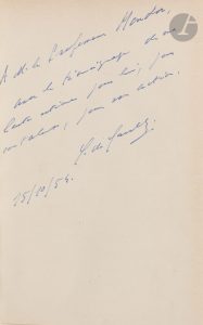 orné, tête dorée, couvertures et dos conservés (E. & A. Maylander)...Édition originale du premier volume des Mémoires de guerre du général de Gaulle...Exemplaire sur papier d’édition, portant ce très bel envoi de l’auteur au célèbre médecin et historien Henri Mondor (1885-1962) :.A M. le Professeur Mondor, // avec le témoignage de ma // haute estime pour lui, pour // son talent, pour son action. // G. de Gaulle. // 15 / 10/ 54..Bel exemplaire avec une belle provenance, bien complet de la double couverture, la première rempliée...Il est joint le fac-similé de la très belle lettre envoyée par Charles de Gaulle le 8 juin 1955 à Edmond Michelet au sujet de son ouvrage Rue de la liberté...Dos très légèrement passé..Provenance : Henri Mondor, avec envoi de l’auteur et ex-libris.