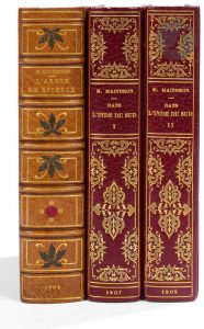 imprimée ; (2 ff.), 304 pp., (2 ff. dernier blanc), couverture imprimée. Demi-maroquin rouge à coins à la bradel, filets dorés, dos lisse richement orné, non rogné, couverture et dos conservés (Carayon)...Édition originale..Il s’agit des souvenirs du second voyage que Maurice Maindron effectua en Inde en 1900-1901 dans le cadre de ses missions scientifiques. Les 2 volumes parurent à deux années d’intervalle...Un des 30 exemplaires numérotés sur papier de Hollande pour chacun des deux volumes, paraphés par l’éditeur...Très bel exemplaire en reliures uniformes de Carayon.