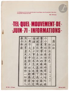 parus, de cette revue d’avant-garde...Cette revue littéraire avait été fondée en 1960 aux Éditions du Seuil par Jean-Edern Hallier et Philippe Sollers. Bien que se voulant apolitique, elle glissa petit à petit vers le maoïsme. Ces 3 numéros parurent en parallèle de cette revue et marquent la rupture du mouvement et de Sollers en particulier avec le parti communiste français, les anciens alliés...Le premier numéro est illustré sur la couverture de deux dessins de Françoise Rojare, dont une caricature représentant Mao Zedong tirant sur Brejnev et Nixon, c’est-à-dire « sur L’Obs et son employé mal rétribué » selon Sollers. Le double numéro 2/3 est entièrement consacré à la Chine, avec sur la couverture un poème en chinois de Mao Zedong dont la traduction française se trouve en quatrième de couverture.
