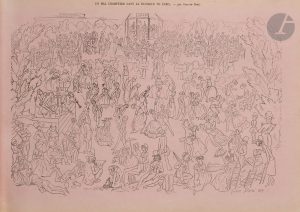 (reliure du début du XXe siècle)...Album réunissant sur 56 feuillets plus d’une centaine de gravures sur bois tirées du Journal pour rire. ..Il s’agit de la réunion de feuilles de papier peint comique publié par Aubert. Le premier album de ce genre parut en 1850, composé de 28 feuilles de papier vert, annoncé plus précisément le 12 octobre 1850 dans la Bibliographie de la France. Aubert en publia une série de 6 ; on en retrouve la publicité notamment dans le Journal des débats politiques et littéraires du 1er septembre 1851 où il est indiqué : « Ces papiers peints contiennent un nombre infini de dessins non politiques, par les dessinateurs du Journal pour rire ; les dessins sont tous variés non seulement dans toute l’étendue du rouleau, ce qui n’existe jamais dans les papiers peints ordinaires, mais encore dans six rouleaux différents, en sorte qu’on peut tapisser une pièce de six rouleaux sans qu’un seul dessin se trouve répété. — Ces six rouleaux existent en cinq fonds différents, savoir : bleu - vert - rose - jaune et blanc. Le prix de chaque rouleau est de 1 franc 75 cent. Pour pouvoir les établir à ce prix, il a fallu les imprimer en double largeur ; le rouleau se vend en conséquence 3 francs 50 cent. ».Au-dessus de cette publicité figure cet intéressant encart : « Les papiers peints comiques de la maison Aubert ont obtenu un si grand succès que le tirage des deux premiers rouleaux, tirage à 2000 exemplaires, est déjà épuisé. Un tirage nouveau, auquel un troisième rouleau a été ajouté, vient d’être fait, de telle sorte qu’on peut, sans avoir un seul sujet répété, tapisser avec les papiers peints comiques d’Aubert une pièce de six rouleaux ordinaires. Ces papiers conviennent particulièrement pour un cabinet à la campagne, une petite salle à manger, une anti-chambre, etc., etc. »..Cet exemplaire est imprimé sur papier rose et contient plusieurs gravures de Gustave Doré, dont « Un Bal champêtre dans la banlieue de Paris », « Les Bains de mer », « Une fête de village », etc., mais également d’Édouard de Beaumont, Henry Emy, Gustave Janet, Edmond Morin, Bouchot, Bertall, Charles Vernier, Nadar, etc...Exemplaire complet de la couverture, ici à l’adresse du 20 rue Bergère, occupée par le Journal pour rire à partir de janvier 1853, ce qui permet de dater la parution de l’album entre cette date et 1855, année du dernier numéro du journal...Dos et coins frottés. Déchirures, pliures et restaurations à la couverture. Petite déchirure à un angle du premier feuillet, sans atteinte aux gravures.