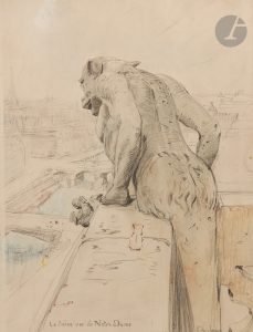 l’éditeur...Édition originale rare tirée à seulement 75 exemplaires numérotés sur papier vélin de Rives, de ce remarquable album de 10 eaux-fortes de Charles Jouas...Meunier, dans sa préface, rapporte les mots de l’artiste quant au but de cette suite : « J’ai cherché dans mes estampes à être un témoin véridique de notre temps et à fixer quelques visages de coins aimés de notre» vieux Paris», menacés par la pioche impitoyable des démolisseurs. C’est dans ce sentiments que, sur un plan conçu avec Alfred Porcabeuf, nous avons entrepris un «Paris vu de Notre-Dame» qui sera un tour d’horizon parisien. Vous voyez le contraste cherché : Notre-Dame, représentant l’immuable relatif, alors qu’autour d’elle et au delà la ville est en continuel changement. Ces «vieilles pierres» sans cesse bouleversées, meurtries, plus elles deviennent rares, plus je les affectionne et en veux garder le souvenir… » (pp. 10-11)...Ces planches furent commencées en 1905 et exposées à la Galerie Simonson à la « Gravure originale en noir en 1910 et 1913 », avant d’être publiées en volume dans cette édition de 1949 avec le concours de madame Jouas et de l’imprimeur Alfred Porcabeuf...En plus des 10 eaux-fortes présentées à pleine page, on trouve 4 gravures dans le texte et une sur la couverture de Charles Jouas, ainsi qu’un portrait de l’artiste en frontispice, par Henri Royer...Exemplaire enrichi d’un dessin original signé de Charles Jouas, figurant la Seine vue de Notre-Dame. ..Exemplaire parfaitement conservé.