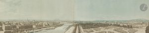 [PANORAMA]..Panorama de Paris pris du pavillon de Flore..Paris : Rittner et Goupil, Nepveu, [1837]. — 4 feuillets collés en 2 grandes feuilles de 32 x 97,5 cm, enroulés...Même panorama que précédemment, épreuve postérieure tirée à 35...