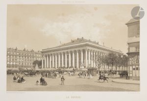 ff.), 76 pp., (1 f.), 44 pp., (1 f.), 24 pp., (1 f.), 22 pp., (1 f.), 36 pp., (1 f.), .26 pp., 22 planches ; (4 ff.), 76 pp., (1 f.), 80 pp., (1 f.), 34 pp., (2 ff.), 1 plan, 28 planches. Demi-chagrin rouge à coins, filets dorés, dos à nerfs orné, tranches mouchetées (reliure de l’époque)...Une des plus importantes et des plus ambitieuses publications sur Paris, illustrée de 41 vignettes gravées sur bois dans le texte, dont une répétée sur le titre, et de 100 lithographies hors texte, dont un plan de Paris, tirées sur fond teinté et parfois en couleurs..Œuvre collective, elle eut parmi les rédacteurs Louis Énault, Édouard Fournier, Eugène de La Gournerie, Mary Lafon, Prosper Mérimée, Viollet Le Duc, etc., et parmi les illustrateurs Philippe Benoist, Jules David, Guérard, etc. Les lithographies ont été pour la majorité faites d’après photographies..Coins émoussés, frottements d’usage, usures à certaines coiffes. Second plat du second volume taché. Le frontispice et la planche 24 dans le premier volume sont déreliés et présentent des déchirures sans manque. Le frontispice du second volume est en partie défait. Rousseurs. Mouillure claire dans la marge de quelques feuillets dans le second volume.