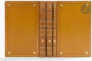 complète, revue et corrigée Avec Glossaire, Variantes, Notices biographiques, etc..Gand : Librairie ancienne et moderne de Duquesne ; Paris : Claudin, 1859-1860. — 3 volumes in-16, 173 x 107 : frontispice, (2 ff.), 335 pp. ; (2 ff.), 324 pp. ; (2 ff.), 112 pp. Maroquin citron, triple filet doré en encadrement et tête de satyre dorée aux angles sur les plats, dos à nerfs orné de motifs et de têtes de satyres dorés, dentelle dorée intérieure, tranches dorées (Émile Rousselle)...Lachèvre, Les Recueils Collectifs de poésies libres et satiriques, p. 53...Réimpression très rare, tirée à seulement 134 exemplaires, de cette anthologie de pièces licencieuses parue pour la première fois en 1618 et remaniée en 1619. Elle est illustrée d’un frontispice non signé en tête du premier volume...Il s’agit de la première des 2 réimpressions faites au XIXe siècle, la seconde fut publiée en 1864. Les 2 furent condamnées à être détruites, par jugement du tribunal correctionnel de la Seine en date du 2 juin 1865 et par jugement du tribunal correctionnel de Lille du 6 mai 1868...UN DES 7 EXEMPLAIRES SUR PAPIER DE COULEUR, ici sur papier rose, dans une très belle reliure d’Émile Rousselle...Exemplaire parfaitement conservé malgré les dos légèrement passés.