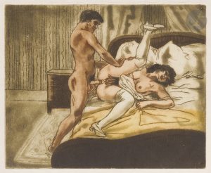 [COURBOULEIX (Léon)]..[Jeux]..S.l., vers 1920-1930. — In-folio, 364 x 272 : 10 planches. En feuilles, sous chemise cartonnée à lacets de l’époque...Suite de 10 eaux-fortes érotiques en couleurs anonymes attribuées à Léon Courbouleix. Elle...