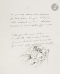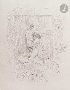 Frick, entièrement gravée et illustrée par Auguste Brouet. Le texte reproduit l’écriture manuscrite de l’auteur. Brouet y a composé 11 eaux-fortes dont une à pleine page entourée de remarques formant un véritable cadre historié...Cette édition n’est pas citée par Dutel qui recense 2 éditions in-8 et une in-4. Elle porte sur le premier feuillet cette justification manuscrite : « Ce manuscrit inédit de Louis de Gonzague Frick orné et gravé par Auguste Brouet a été tiré à cinquante exemplaires numérotés »..Il s’agit en réalité d’un troisième tirage, certainement le plus rare des 3, publié après 1940 sur papier vélin de Rives. Cet exemplaire porte le numéro 9...Exemplaire parfaitement conservé.