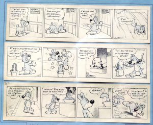 ARNAL. Pif le Chien. Trois strips originaux à l’encre de Chine pour des bandes parues dans L’Humanité début des années 50. Les trois bandes, toutes signées, sont encadrées ensemble. Format total 32 x 26 cm