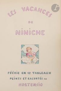 HORTENSIO..Les Vacances de Niniche. Féérie en 12 tableaux peints et racontés par Hortensio..S.l., s.d. — Manuscrit in-4, 324 x 247, de 43 pp. et 12 dessins. En feuilles, sous chemise cartonnée...Exemplaire unique, entièrement calligraphié et...