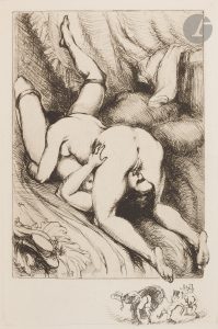 imprimée. Broché, couverture rempliée...Dutel, 1446...Édition non mise dans le commerce, imprimée et publiée par Maurice Dufour, illustrée de 13 eaux-fortes originales libres hors texte du peintre et illustrateur belge Luc Lafnet (1889-1939), signées de son pseudonyme Viset. La préface, portant les initiales S.B., est de Pierre Dufay...Un des 350 exemplaires numérotés sur papier pur fil Lafuma, celui-ci comprenant exceptionnellement 2 états des gravures, en noir et en bistre...Deux petites déchirures à la charnière du premier plat de la couverture.