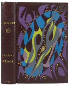 violet, vert, gris et rose de différentes formes, appliquées, formant un O oblique souligné au bord et au centre de pastilles dorées de tailles différentes, dos lisse comprenant le nom de l’auteur et le titre en lettres dorées, encadrement de maroquin bordeaux à l’intérieur, orné d’un filet doré, doublures et gardes de velours vert bordé d’un listel de maroquin gris, non rogné, couverture et dos conservés, étui-boîte à dos et bande à recouvrement et tranches de maroquin bordeaux (Devauchelle)...Édition originale tirée à 600 exemplaires hors commerce de ce chef-d’œuvre de la littérature érotique, publiée par le jeune Jean-Jacques Pauvert, alors âgé de 27 ans. Il s’agit du livre français le plus lu à l’étranger après Le Petit Prince de Saint-Exupéry...Pauline Réage était le pseudonyme de la femme de lettres Dominique Aury, née Anne Cécile Desclos (1907-1998), qui n’a révélé être l’auteur de ce roman que lors d’un entretien avec le journaliste John de Saint-Jorre pour le New Yorker en 1994 soit 40 ans après sa publication. Créatrice de la littérature libertine féminine, elle fut notamment la maîtresse de Jean Paulhan qui signe ici la préface du livre, intitulée Du bonheur dans l’esclavage...Un des 480 exemplaires numérotés sur papier vergé (n° 350). Il est bien orné de la vignette de titre dessinée et gravée à l’eau-forte par Hans BELLMER, tirée en sanguine. Seuls 200 exemplaires comporteraient cette vignette, ils sont de ce fait les plus recherchés..Superbe exemplaire en reliure originale de Devauchelle, parfaitement conservé, condition des plus rares pour cet ouvrage.