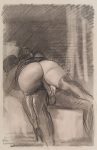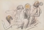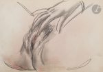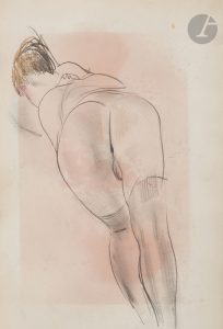 sexe féminin, lanière noire au dos...Précieux et unique album de près de 30 croquis originaux réalisés au crayon gras, la plupart rehaussés en couleurs, par Milivoy Uzelac (1897-1977)...Connu pour ses peintures figuratives ainsi que pour ses nus, Uzelac, qui était peintre mais également illustrateur et sculpteur, suivit les cours de Jan Preisler à l’Académie des Beaux-Arts de Prague. Participant aux salons les plus prestigieux d’Europe, ses œuvres sont largement influencées des artistes français...Dans cet album personnel, les dessins ne sont pas signés. Il s’agit de croquis de scènes érotiques et pornographiques ; le premier figure un ex-libris représentant deux chiens en train de s’accoupler...Exemplaire enrichi de 3 beaux dessins anonymes à la mine de plomb, 2 sur papier vélin représentant une femme faisant sa toilette, et un sur papier calque figurant un couple faisant l’amour. Il ne s’agit pas de dessins d’Uzelac...L’album dans lequel ces dessins ont été réalisés, provient de l’imprimerie Draeger frères...Cartonnage sali, déchirures avec manques au dos.