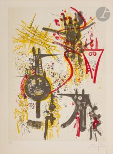 exemplaires sur vélin de Rives, comprenant 2 feuillets de texte et 5 lithographies originales de Guy HARLOFF, Isidore ISOU, Gherasim LUCA, Joaquim FERRER et Wifredo LAM..Chaque épreuve est numérotée et signée par l’artiste..Titre et dernière page brunis.