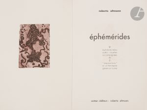 ALTMANN (Roberto)..Éphémérides. 9 éphémérides audio-visuelles accompagnées de 5 «impressions» et un frontispice gravés sur cuivre..[Paris] : Roberto Altmann, [1966]. — In-8, 251 x 165 : (18 ff. 2 premiers et 2 derniers blancs),...