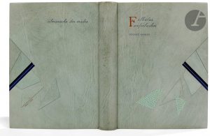plats, deux pièces de peau de serpent collées en plus sur le premier plat, titre et auteur en orange et bleu sur le premier plat, sous-titre en bleu et années en orange sur le second plat, dos lisse, doublures bords à bords de maroquin céladon, gardes de daim bleu foncé, non rogné, couvertures illustrées conservées, chemise à dos et bandes à recouvrement de maroquin céladon, étui (A. Boige)...Collection complète des 5 années de ce célèbre « Almanach des modes présentes, passées et futures »...Chaque fascicule comprend un texte suivi d’un calendrier, ainsi que 15 superbes compositions de George BARBIER (1882-1932), dont une sur la couverture, une sur le titre, une en tête du texte, la seule en noir, et 12 hors texte coloriées au pochoir. Les textes sont de la comtesse de Noailles (Lettre à Georges (sic) Barbier sur les modes, 1922), Colette (Modes, 1923), Cécile Sorel (Glorifions la coquetterie, 1924), Gérard d’Houville (Falbalas et Fanfreluches, 1925) et la baronne de Brimont (Le Songe d’Ève, 1925)...Très bel exemplaire en reliure doublée d’Annie Boige, parfaitement conservé. Seule la couverture du premier fascicule est légèrement abîmée..Provenance : Marie-Josée Guian, avec ex-libris.
