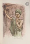 ff.), couverture imprimée. Maroquin noir, plats ornés de deux bandes verticales parallèles composées de motifs à froid et mosaïqués de maroquin orange en forme de polygones identiques, partant du bord supérieur et descendant sur les trois quart des plats, desquels jaillissent 21 filets dorés ondulés, listel horizontal de maroquin orange sur le bas des plats passant par le dos, titre doré et mosaïqué de maroquin orange au centre du premier plat, entre les deux bandes verticales ; dos lisse orné de filets dorés, prolongement des filets des plats, encadrements de maroquin noir et orange à l’intérieur, orné de deux cadres de deux filets dorés, doublures et gardes de soie orange dorée, doubles gardes, non rogné, couverture et dos conservés, étui (Pierre Legrain)...Édition tirée à 550 exemplaires, celui-ci un des 500 sur vergé à la forme des papeteries d’Arches...Exemplaire unique, comprenant en lieu et place des illustrations de Henri Dethomas, 20 dessins originaux rehaussés à l’aquarelle du peintre et illustrateur Henry CHAPRONT (1876-1965), dont un sur le titre, 3 dans le texte et 16 à pleine page. Tous les dessins, à l’exception de ceux des pages 19 et 21, sont signés par l’artiste...Précieux exemplaire relié par Pierre Legrain, parfaitement conservé.