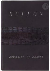 COSTER (Germaine Marguerite de)..Buffon. Lettre-préface de Georges Duhamel..S.l., [1951]. — In-folio, 440 x 310 : 101 pp., (5 ff. dernier blanc), couverture muette. Box noir, dos et plats traversés par une large bande de peau de serpent teintée,...