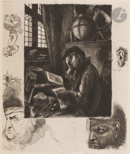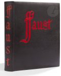 : frontispice, (2 ff.), X, 160 pp., (1 f.), 11 planches, couverture imprimée. Maroquin noir, titre « Faust » en lettres mosaïquées de box rouge en léger relief sur le premier plat, dos lisse orné de même, maroquin noir et listel de box rouge en encadrement à l’intérieur, doublures et gardes de soie moirée noire, tranches dorées sur témoins, couverture et dos conservés, étui (Creuzevault)...Édition tirée à 439 exemplaires, illustrée de 12 eaux-fortes originales hors texte et 38 vignettes gravées sur bois de Jean-Gabriel DARAGNÈS (1886-1950)..Un des 25 exemplaires in-4 raisin sur papier de Hollande van Gelder, celui-ci comprenant 3 états des eaux-fortes (eau-forte pure sur japon, état avec remarques sur vélin et état définitif sur hollande), une suite des bois sur chine, une gravure refusée en 2 états (eau-forte pure sur japon, état avec remarques sur vélin), ainsi qu’un dessin original signé de l’artiste, étude pour la seconde planche..Très bel exemplaire relié par Maylander..Rousseurs affectant essentiellement les marges des planches.