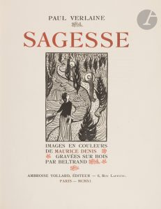 DENIS (Maurice) - VERLAINE (Paul)..Sagesse..Paris : Ambroise Vollard, 1911. — In-4, 286 x 227 : (4 ff.), 100 pp., (2 ff. premier blanc), couverture imprimée. Reliure en bois à charnières ouvrant sur l’arrière, sur le premier plat figure une...