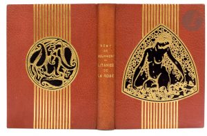 recouverte d’une plaque dorée sur une pièce de maroquin noir, représentant une femme nue assise sur un parterre de roses sur le premier plat, et une rose accompagnée de ses feuilles sur le second plat, dos lisse, triple filet doré intérieur, tête dorée, non rogné, couverture et dos conservés (René Kieffer)...Belle édition de luxe, la première illustrée, ornée de 59 compositions coloriées au pochoir à pleine page, d’un encadrement gravé sur bois tiré en bistre sur fond or à chaque page et de lettrines gravées de même, par le décorateur, illustrateur et critique d’art André DOMIN (1883-1962)...Tirage à 560 exemplaires ; un des 50 sur japon accompagnés d’une suite des illustrations en noir sur japon pelure...Très bel exemplaire en reliure originale de René Kieffer.