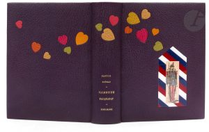 et dos ornés de cœurs mosaïqués de maroquin vert, orange, rose, ocre, havane et beige, et sur le premier plat d’une gravure d’un soldat dant une guérite à bandes multicolores obliques, recouverts d’un plastique transparent, dos lisse, doublures de maroquin fauve, gardes de daim bleu, tête dorée, non rogné, couverture et dos conservés, chemise à dos et bandes à recouvrement de maroquin violet, étui (Marie-José Guian - D. H. Mercher)...Première édition illustrée, formant le 40e ouvrage de la collection « Les Beaux livres », tirée à 1065 exemplaires. Elle est illustrée de 98 compositions en couleurs de Charles Auguste EDELMANN (1879-1950) dont 2 eaux-fortes hors texte et 96 compositions dans le texte coloriées au pochoir..Un des 935 exemplaires sur Rives, celui-ci enrichi exceptionnellement d’une suite des illustrations en noir sur chine..Très bel exemplaire, relié par Marie-José Guian et Daniel-Henri Mercher..Exemplaire parfaitement conservé.