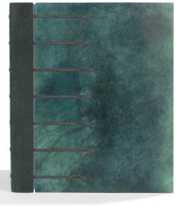7 bandes de cuir cousues à l’aide de fils vert et noir, dos lisse de peau de serpent teintée vert foncé, doublures de daim gris, gardes de peau de serpent teintée vert sombre, en prolongement du dos, doubles gardes, non rogné, couverture et dos conservés, emboîtage de maroquin gris, doublé de daim de même couleur (Sün Evrard 1996)...Édition illustrée de 48 compositions en couleurs et de 79 vignettes en noir d’André HAMBOURG (1909-1999), peintre officiel de la Marine, gravées sur bois par Gérard Angiolini et Gilbert Rougeaux...Tirage à 231 exemplaires plus quelques exemplaires pour les collaborateurs. Un des 41 premiers sur japon nacré, celui-ci faisant partie des 36 comprenant un dessin original signé, une épreuve sur soie d’une des illustrations, une suite des illustrations sur pur fil de Hollande et la décomposition d’une des gravures...Envoi de l’artiste à la justification, accompagné d’un dessin original au crayon. Le destinataire n’est pas mentionné...Superbe exemplaire relié par Sün Evrard en 1996.